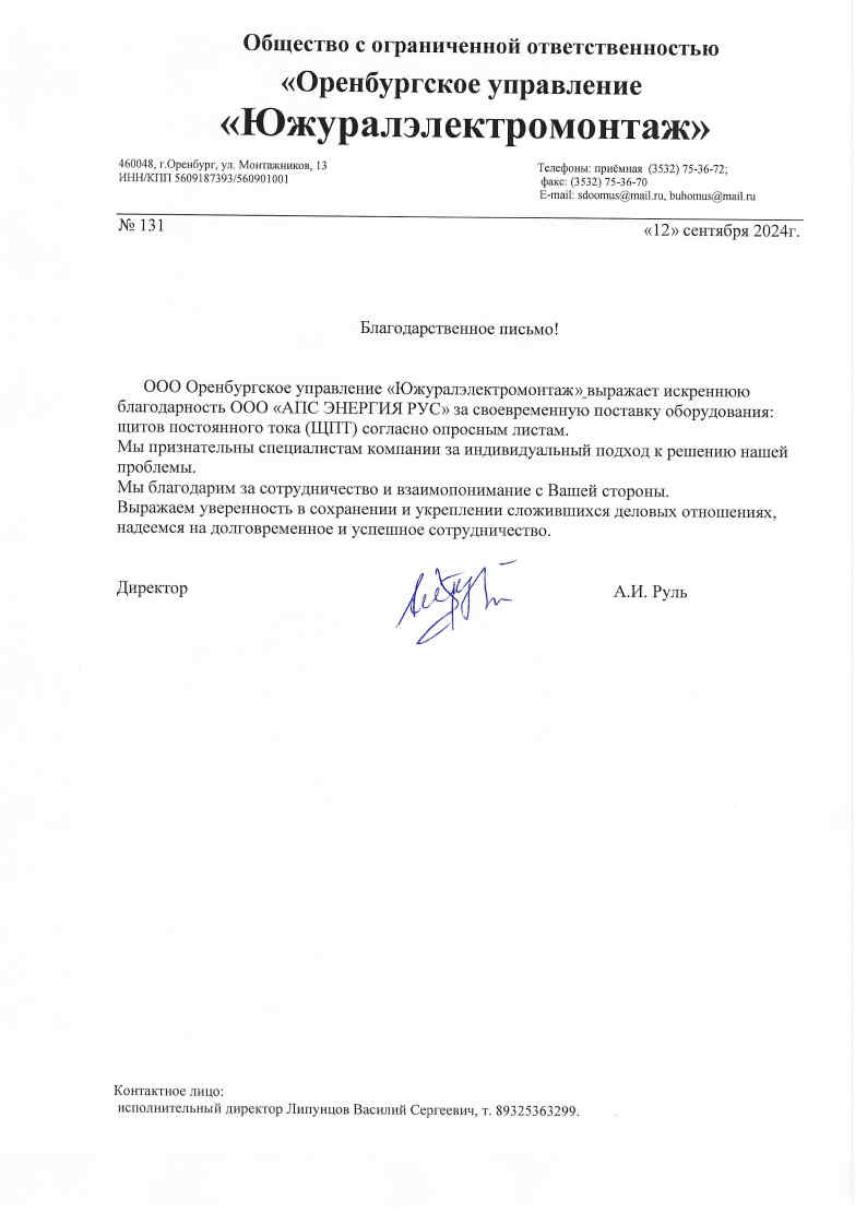 ООО Оренбургское управление «Южуралэлектромонтаж› выражает искреннюю благодарность ООО «AПC ЭНЕРГИЯ PYC» за своевременную поставку оборудования: щитов постоянного тока (ЩПТ) согласно опросным листам.