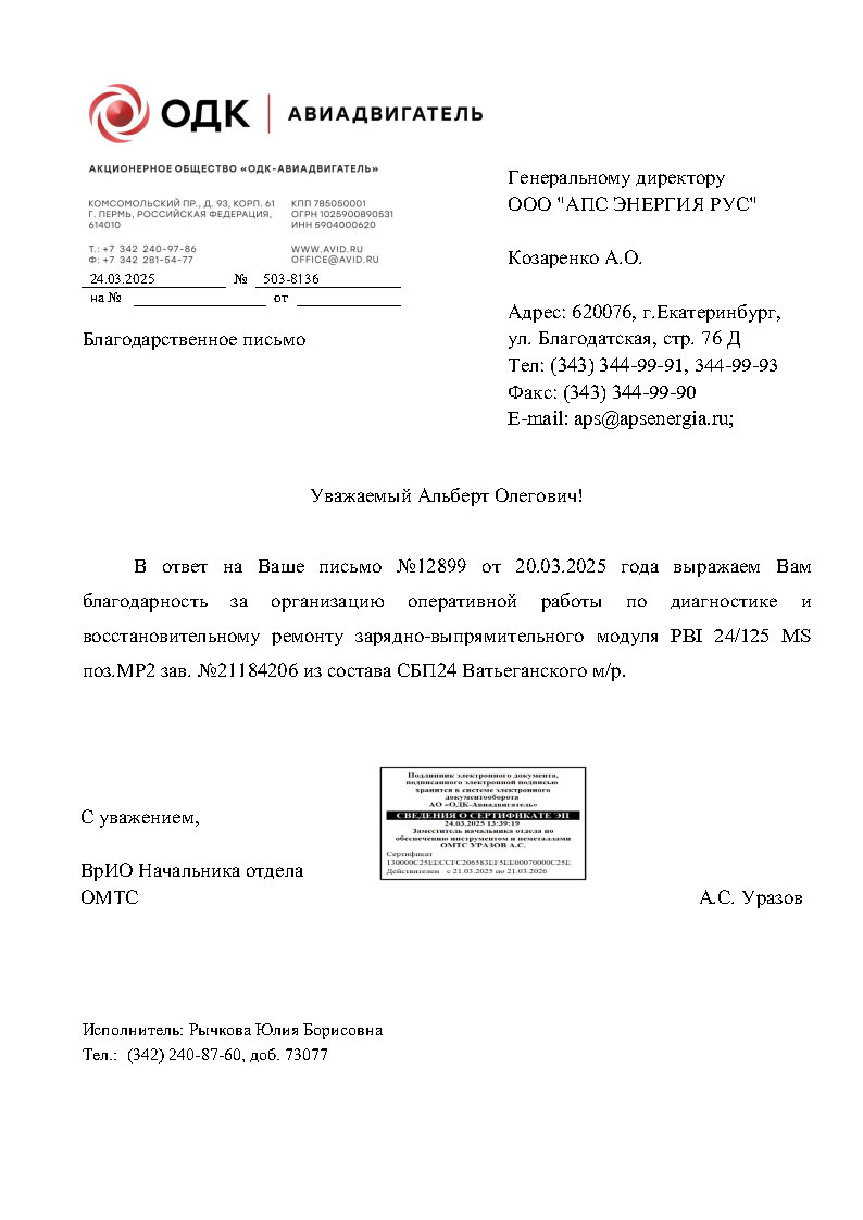 АО "ОДК-Авиадвигатель" выражает Вам благодарность за организацию оперативной работы по диагностике и восстановительному ремонту зарядно-выпрямительного модуля PBI 24/125 MS из состава СБП24 Ватьеганского м/р.