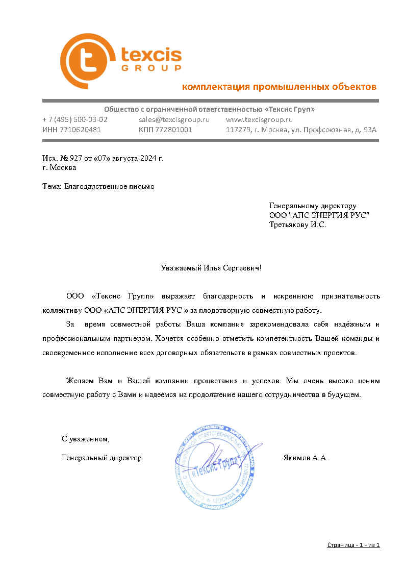 ООО «Тексис Групп» выражает благодарность и искреннюю признательность коллективу ООО «АПС ЭНЕРГИЯ РУС » за плодотворную совместную работу. За время совместной работы Ваша компания зарекомендовала себя надёжным и профессиональным партнёром. Хочется особенно отметить компетентность Вашей команды и своевременное исполнение всех договорных обязательств в рамках совместных проектов.
